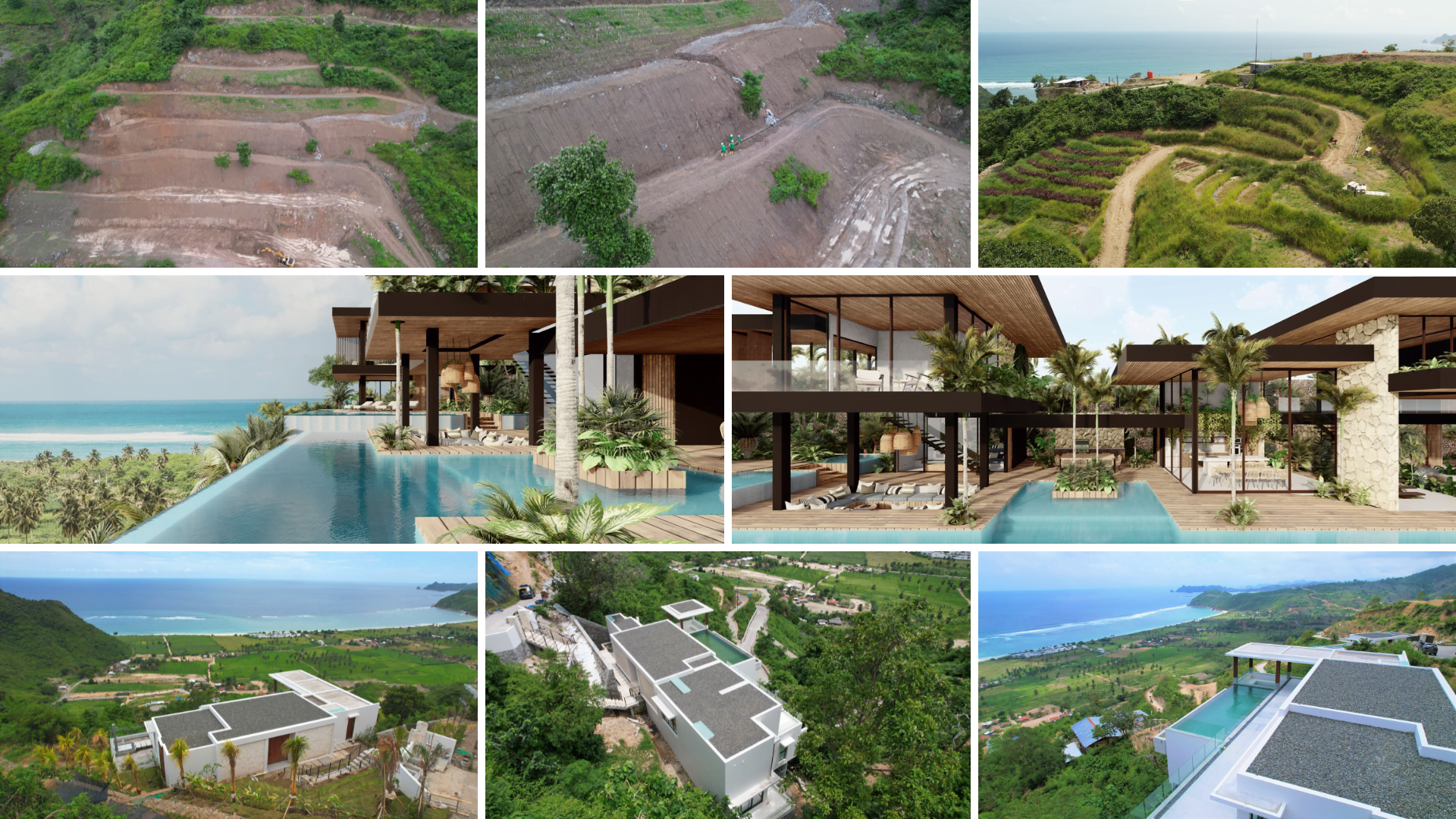 Top images show the grounds being prepared for the upcoming villa construction at Samara Bay; middle images are villa renders; bottom images are the completed villas.